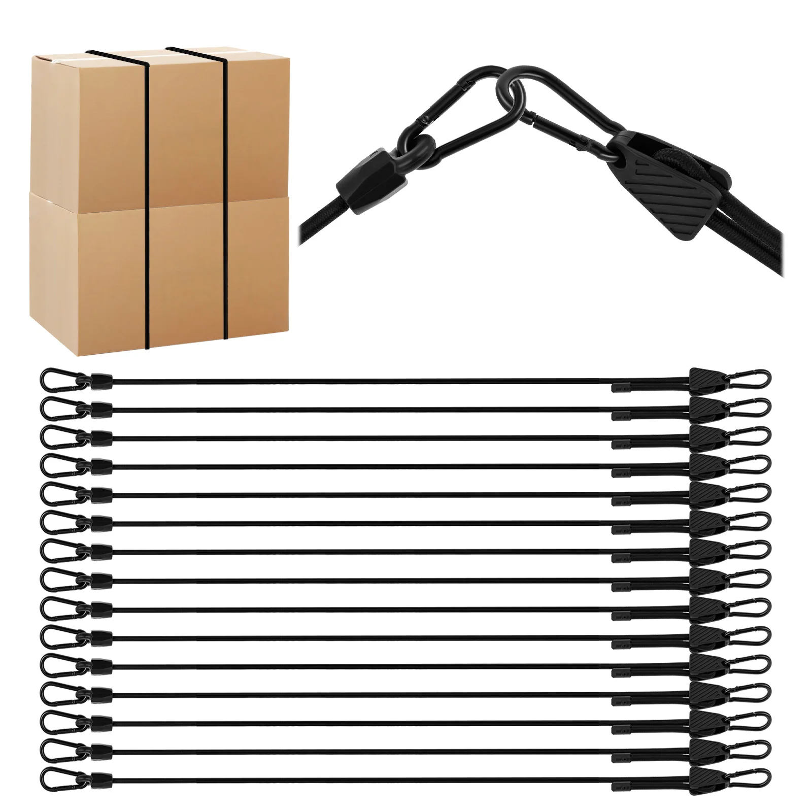 Set di corde elastiche regolabili da 16 pezzi con moschettone regolabile da 7 a 48 pollici Cinghia elastica elastica nera resistente agli agenti atmosferici