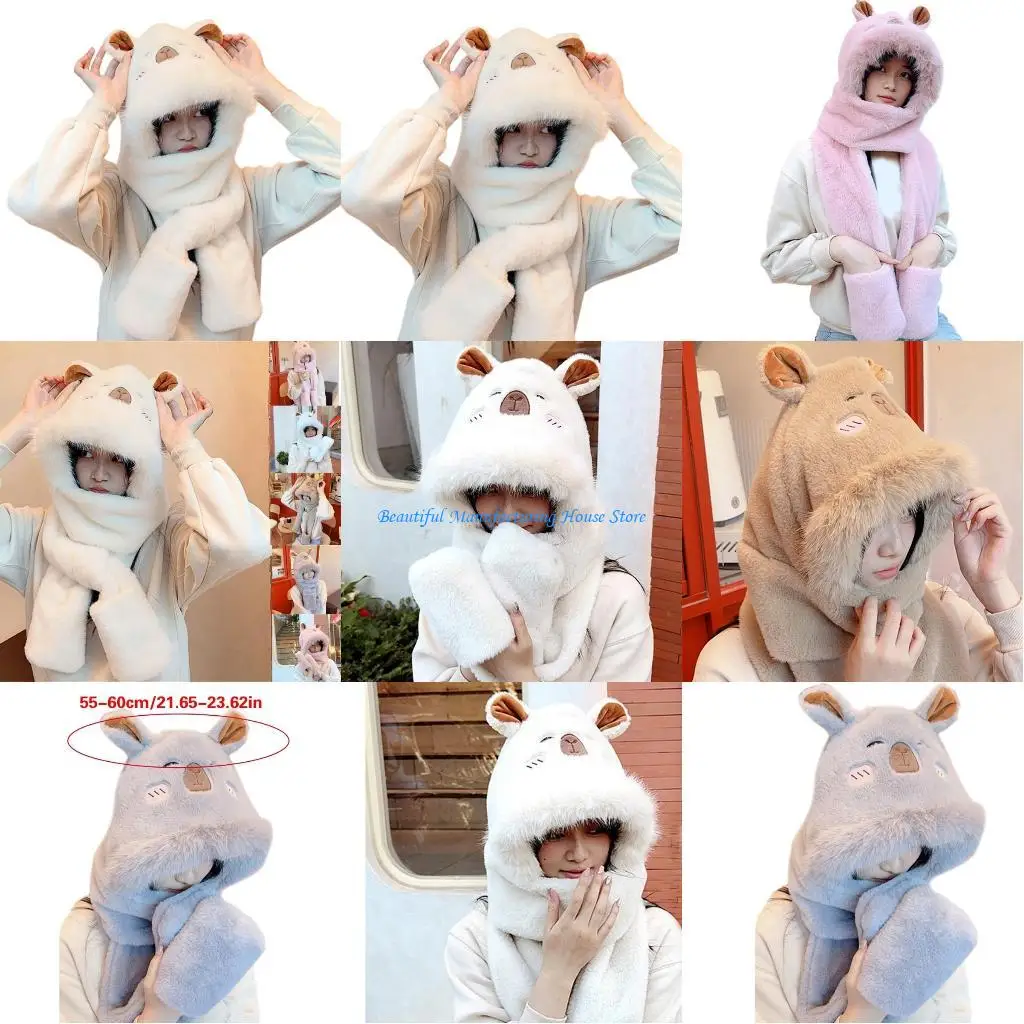 E56A Guanti multiuso con sciarpa per orecchie da orso, cappello con paraorecchie, berretti caldi invernali per attività