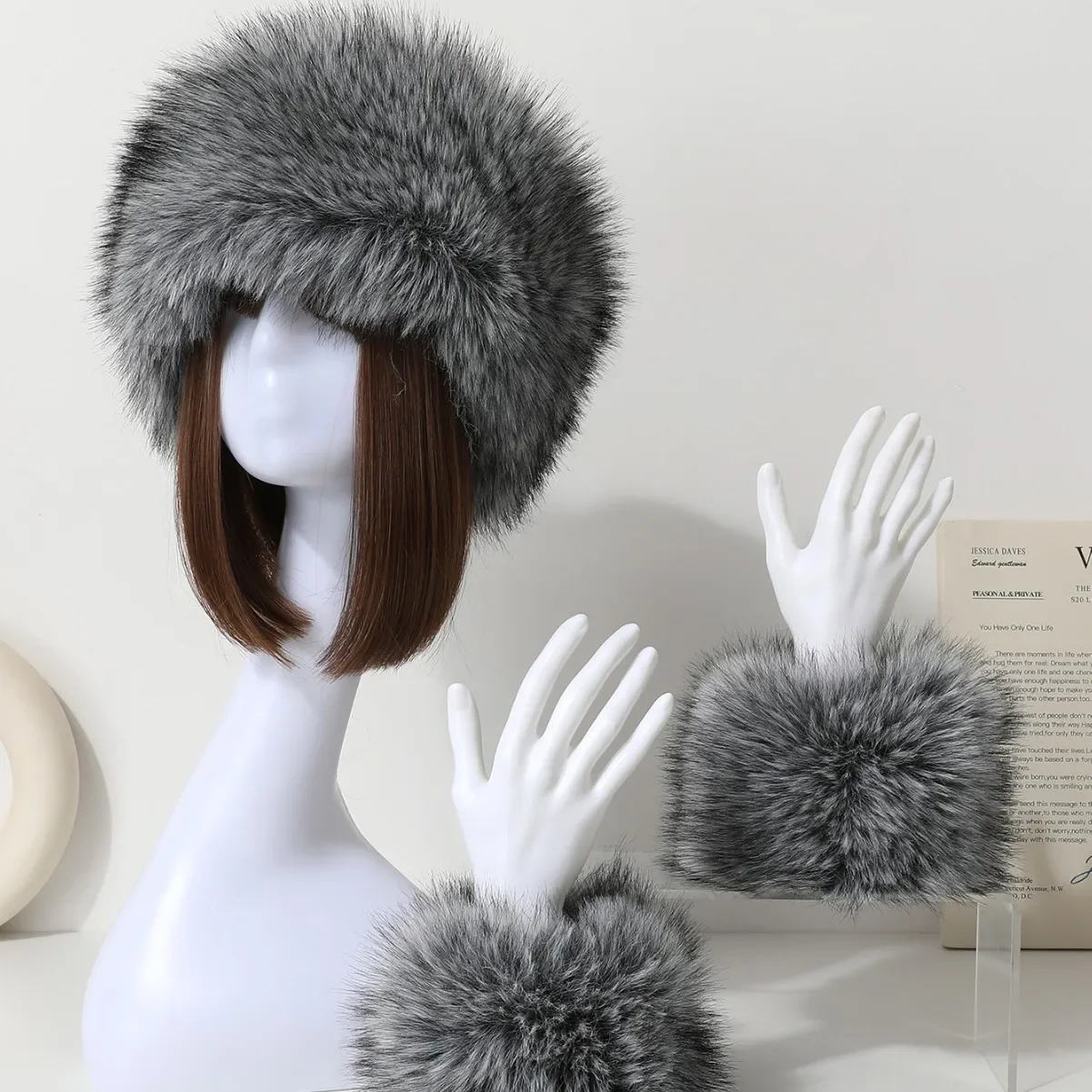 Cappello e maniche in pelle simulata di pelliccia di coniglio ispessita Set da due pezzi per protezione invernale calda per le orecchie e il polso da donna