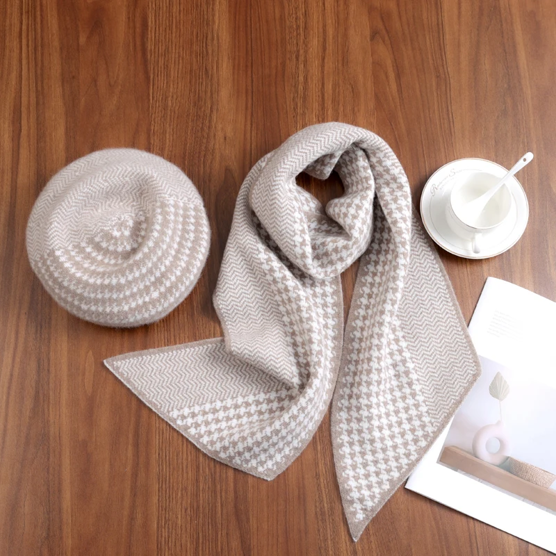Sciarpa pied de poule in pura lana 100% berretto set in due pezzi autunno inverno versatile scaldacollo da donna in stile europeo e americano