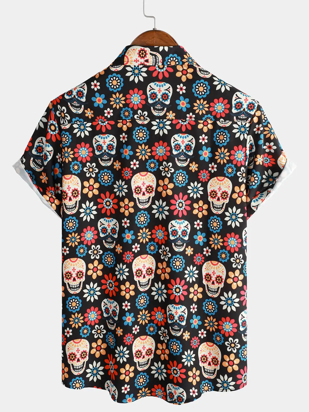 Camicia da uomo con teschio floreale e smiley, moda tropicale, strada hawaiana, casual, a maniche corte, risvolto, moda all'aperto