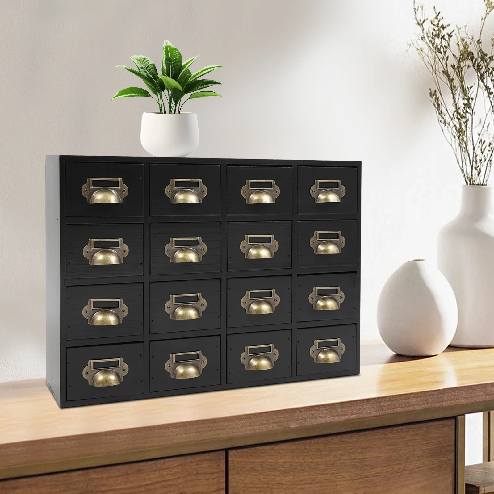 Cassettiera in Legno a 16 Cassetti, 50x10x35 cm, Armadietto Portadocumenti con Maniglie, Cassetti Multi-Livello da Scrivania, Nero