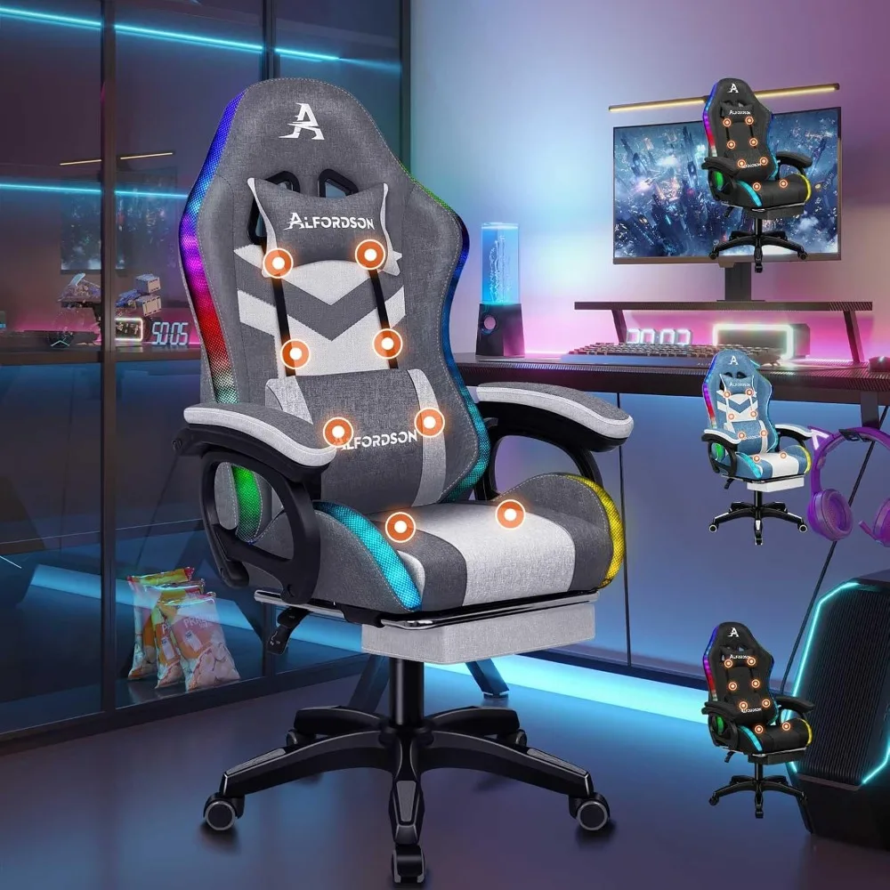 Sedia da gioco per massaggio a 8 punti, luce LED RGB a 12 colori, sedia da ufficio ergonomica con poggiapiedi, poggiatesta e cuscino lombare per bambini