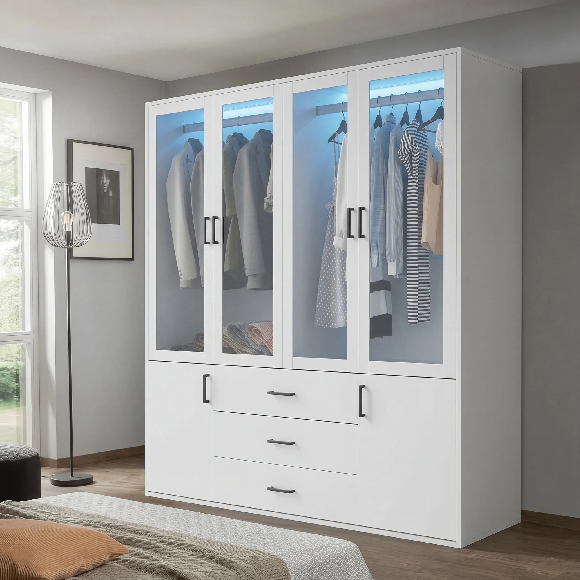 Armadio con Luci LED, Versatile Guardaroba con Ante, Mobile con Asta Appendiabiti, Armadio con Cassetti, Bianco