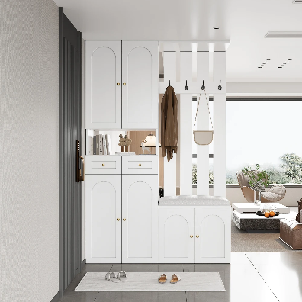 Set Armadio PINGGO con Panca Portascarpe, 4 Ganci, 6 Ante, 2 Cassetti, Bianco, Mobile da Ingresso 110x180x37cm