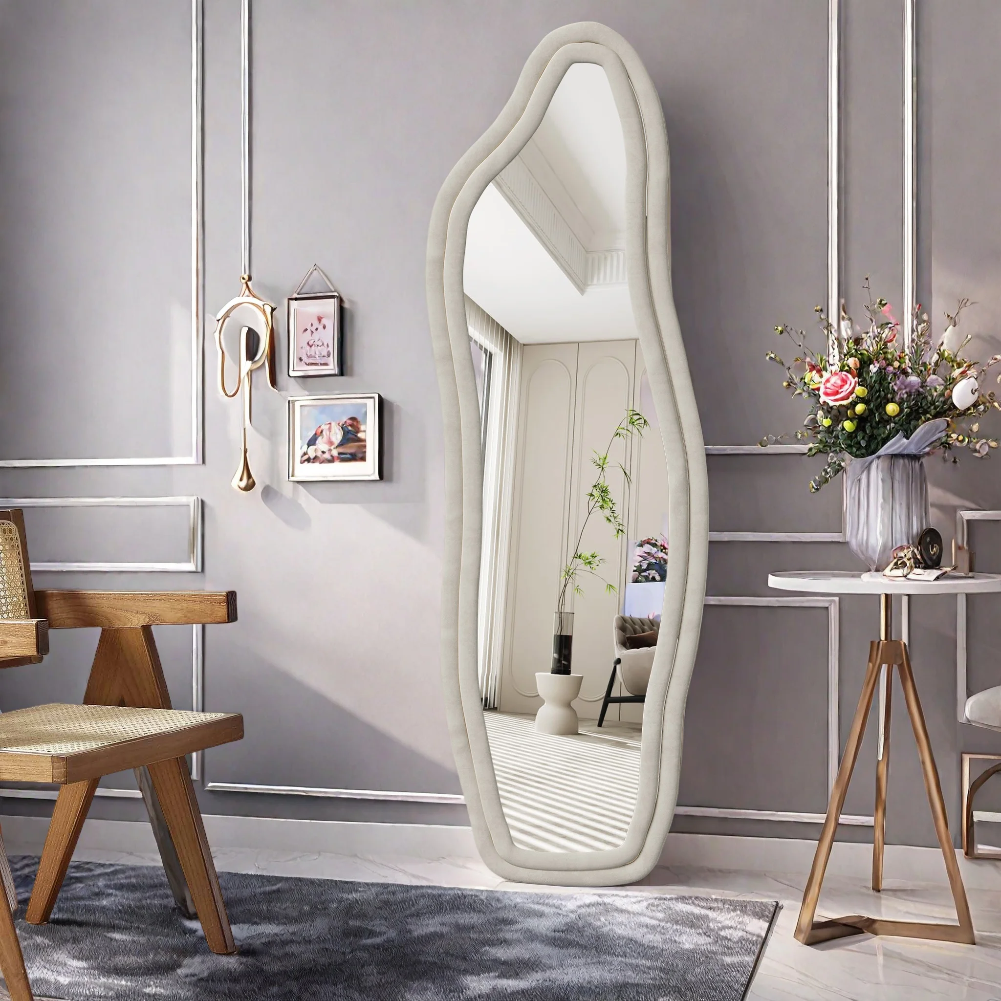 Specchio da terra, 140x45cm, cornice in velluto, forma curva irregolare, vetro temperato, specchio da terra camera da letto, bianco