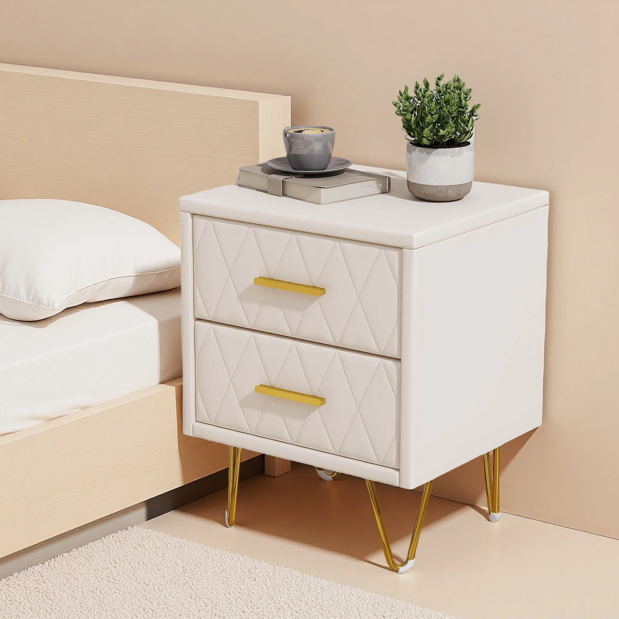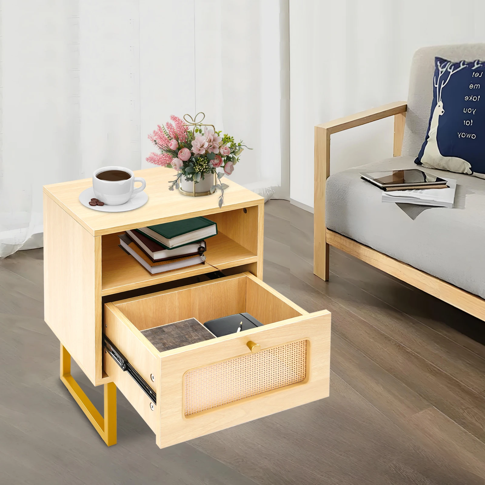 Comodino Rosahqnda, set di 2, tavolino laterale, con cassetto, maniglia, scomparto aperto, tavolino da caffè, per camera da letto, soggiorno, beige