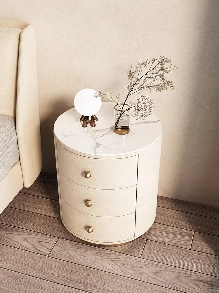 Comodino di lusso leggero Moderno semplice circolare in pelle scamosciata in legno massello Camera da letto con tre cassetti Comodino