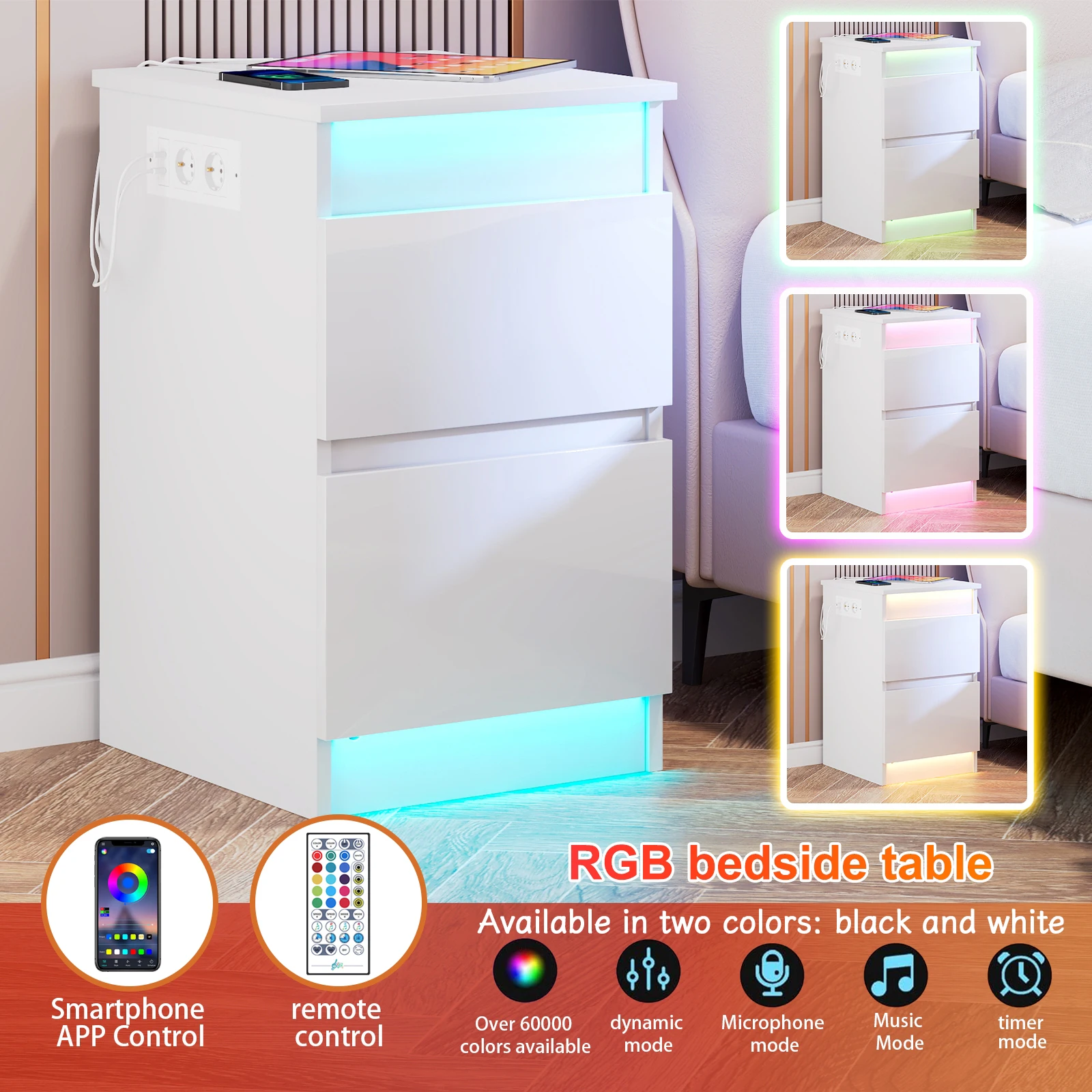 Comodino con 2/3 cassetti, comodino per camera da letto con stazione di ricarica, tavolino LED con vetro scanalato, nero/bianco
