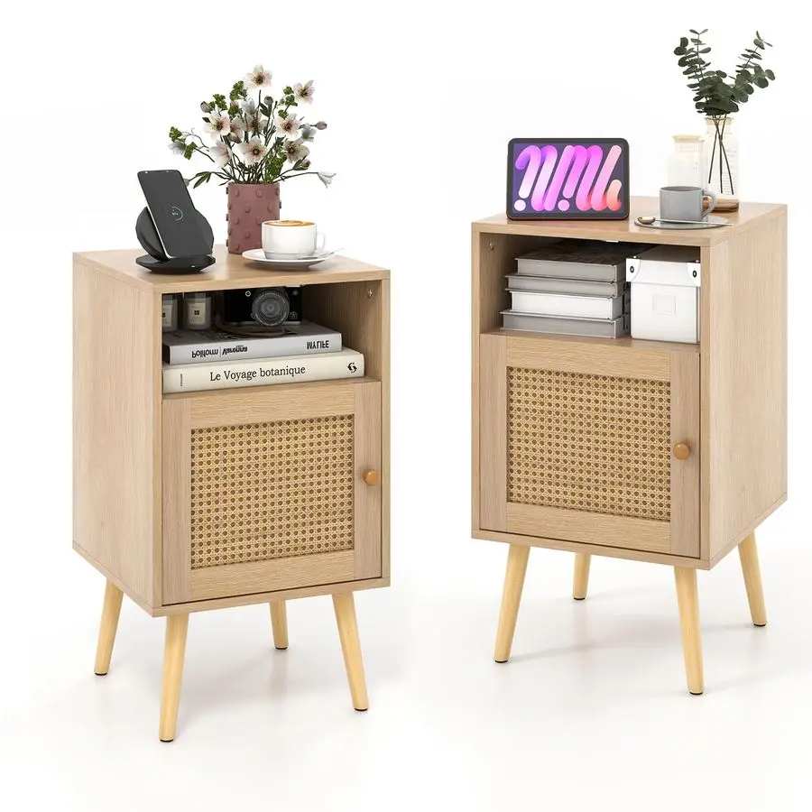 Comodino, anta in canna, gambe in legno massello, comodino, piano spazioso, ripiano aperto e armadio, adatto per soggiorno, camera da letto