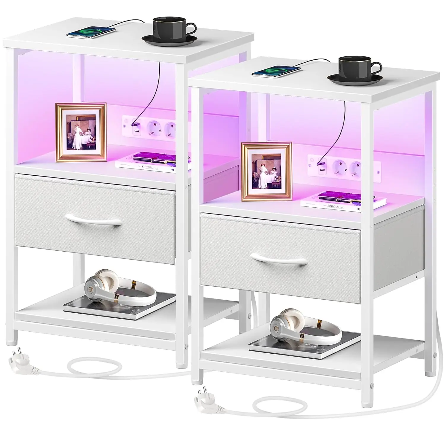 Comodino LED con Presa di Corrente e Cassetto in Tessuto, Tavolino per Camera da Letto e Soggiorno, 40x30x60cm, Set da 2, Personalizzabile