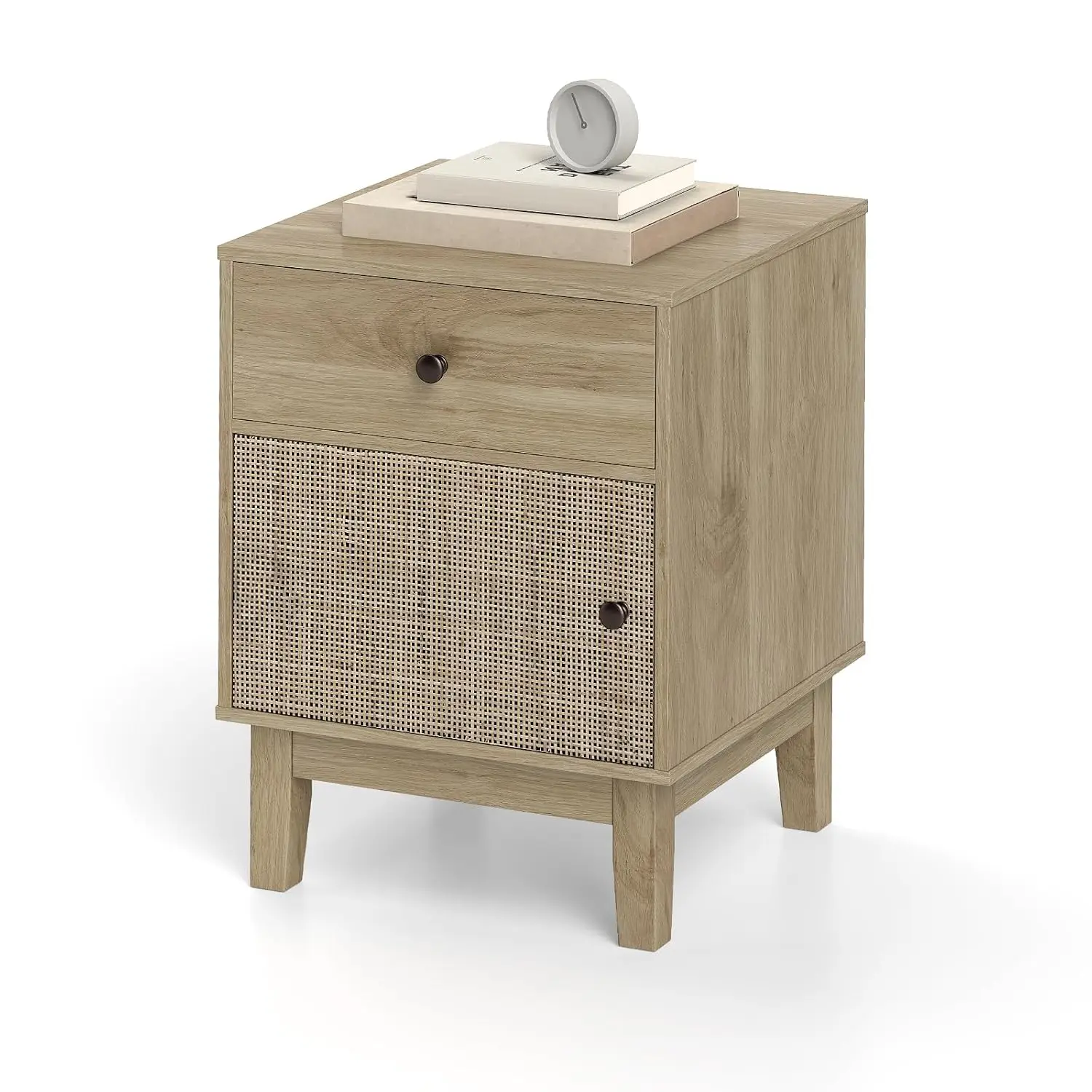 Comodino con Gambe in Pino, Cassetto e Anta in Rattan, Anti-Ribaltamento, 40x39x55 cm, per Camera da Letto, Personalizzabile