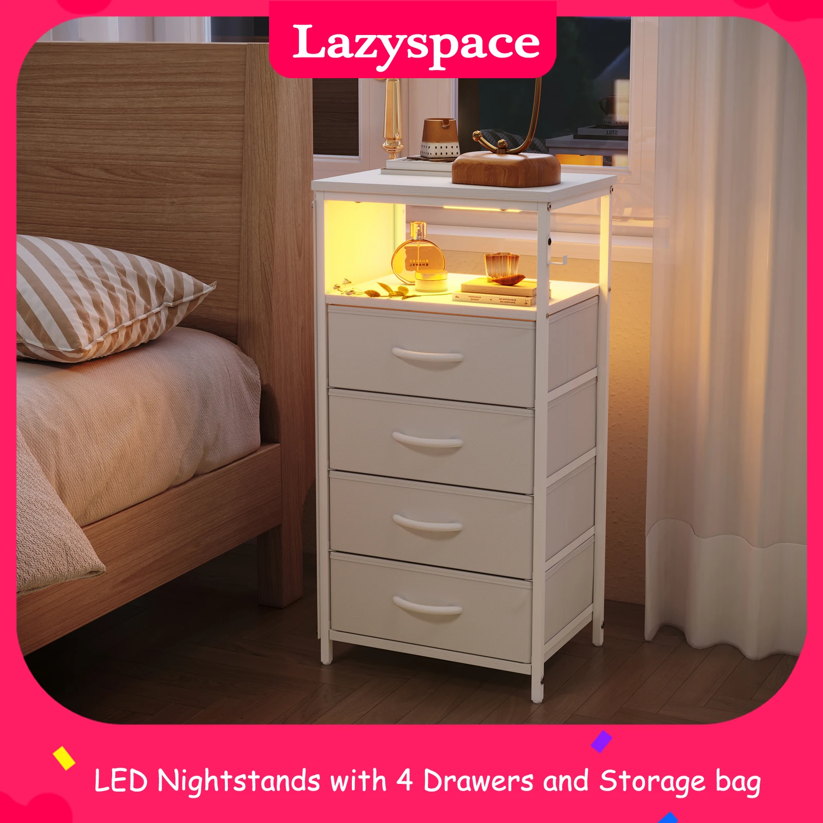 Comodini LED Lazyspace con 4 cassetti, armadietto portaoggetti con custodia, comodino, 2 prese UE 2 porte di ricarica USB
