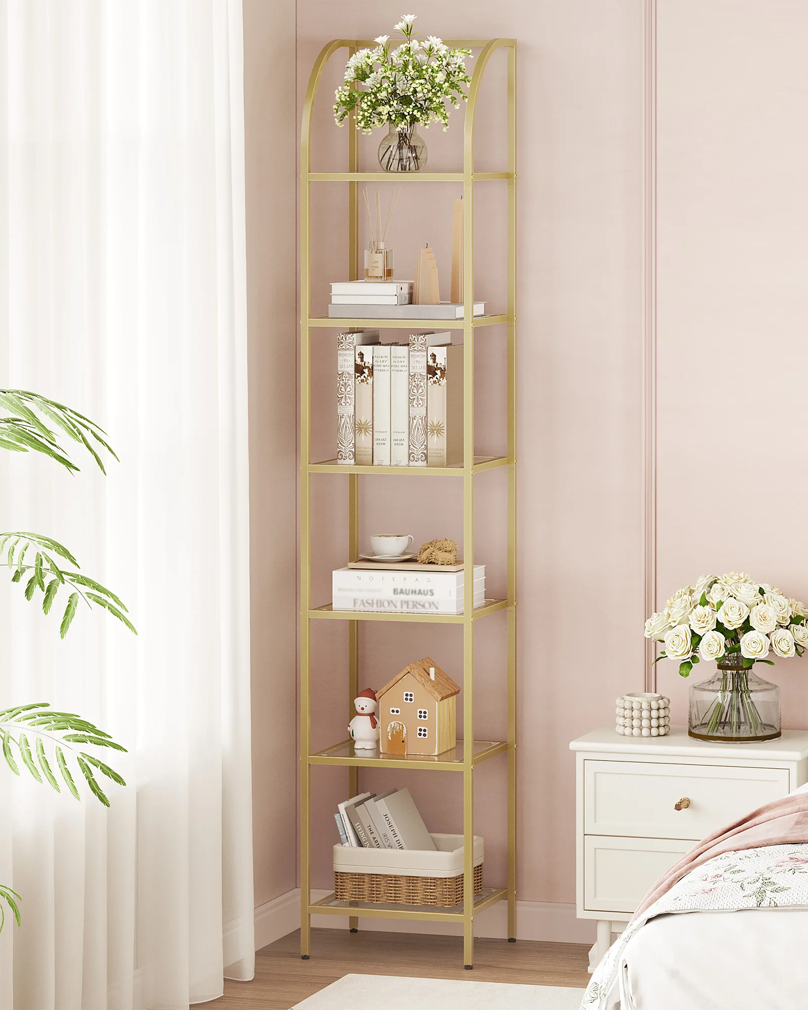 Libreria con Ripiani in Vetro Temperato, Scaffale Sottile per Camera da Letto, Struttura in Acciaio, 6 Ripiani, Oro
