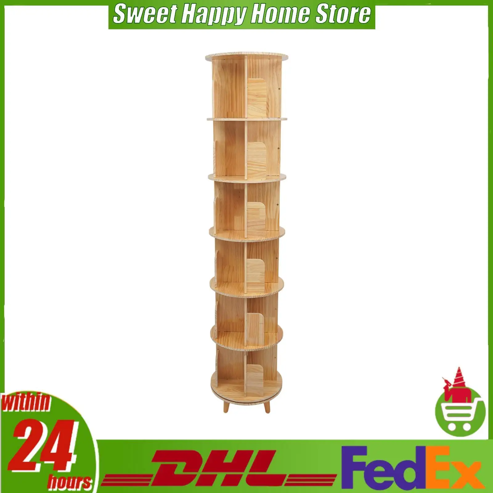Libreria Girevole a 360°, Scaffale Espositivo da Terra a 6 Ripiani, Organizzatore Multifunzionale in Legno di Pino per Bambini e Adulti