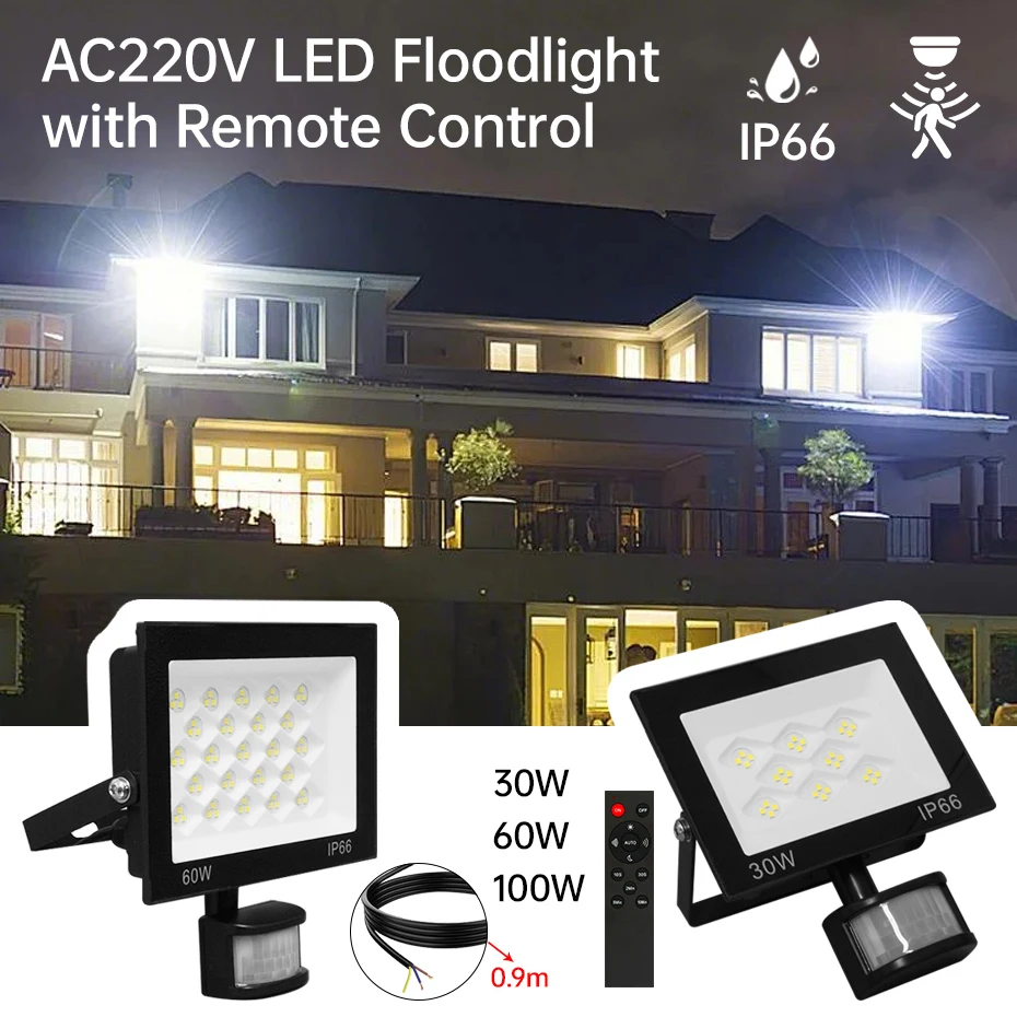 Faretto LED con Sensore di Movimento PIR 30W 60W 100W 220V Luce da Esterno con Telecomando IR IP66 Impermeabile Lampada Stradale