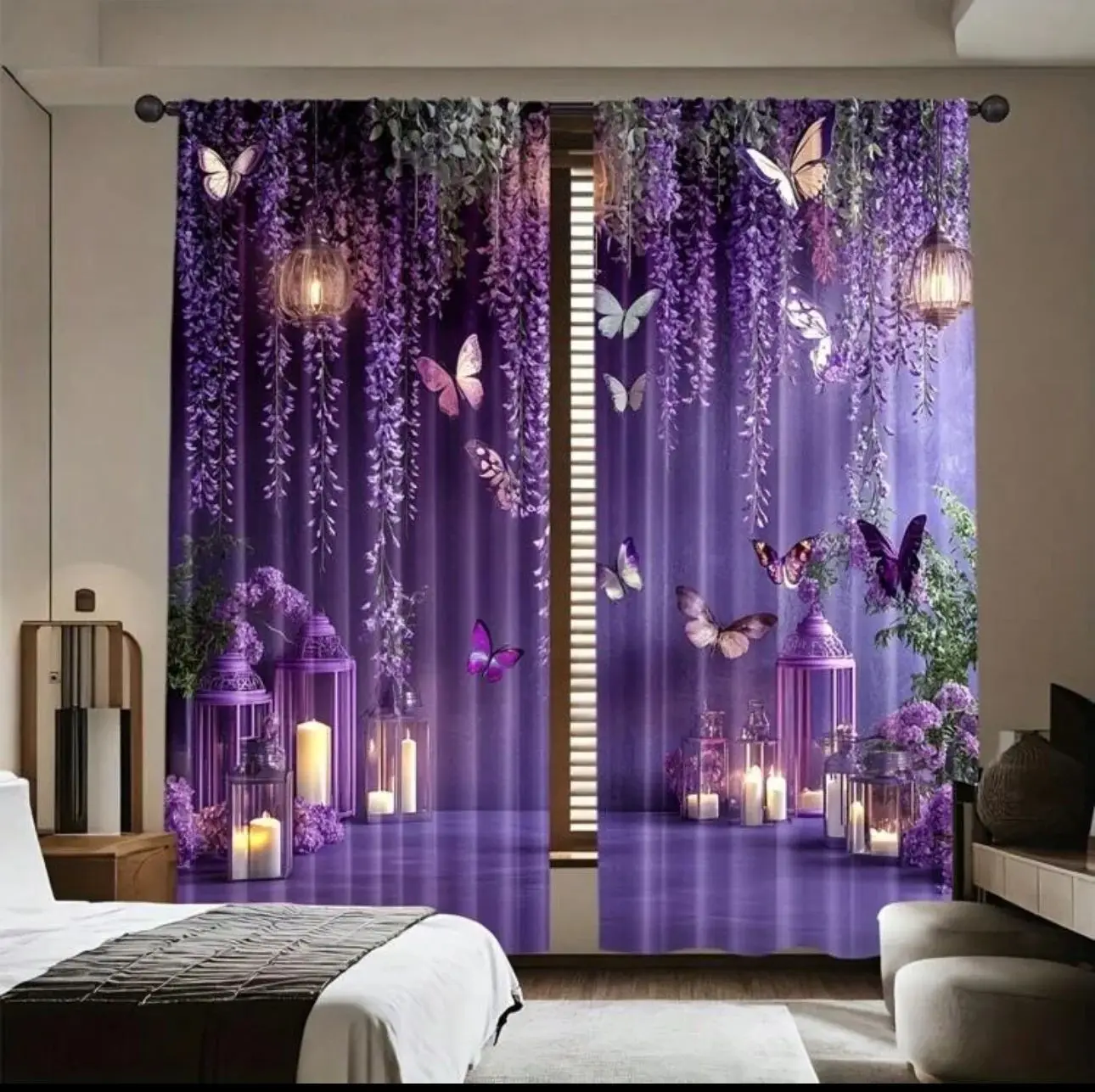 Tende VIKAMA Romantiche con Motivo Floreale Viola e Farfalle, Drappeggio con Motivo a Lanterna per Camera da Letto Principale e Stanza delle Principesse
