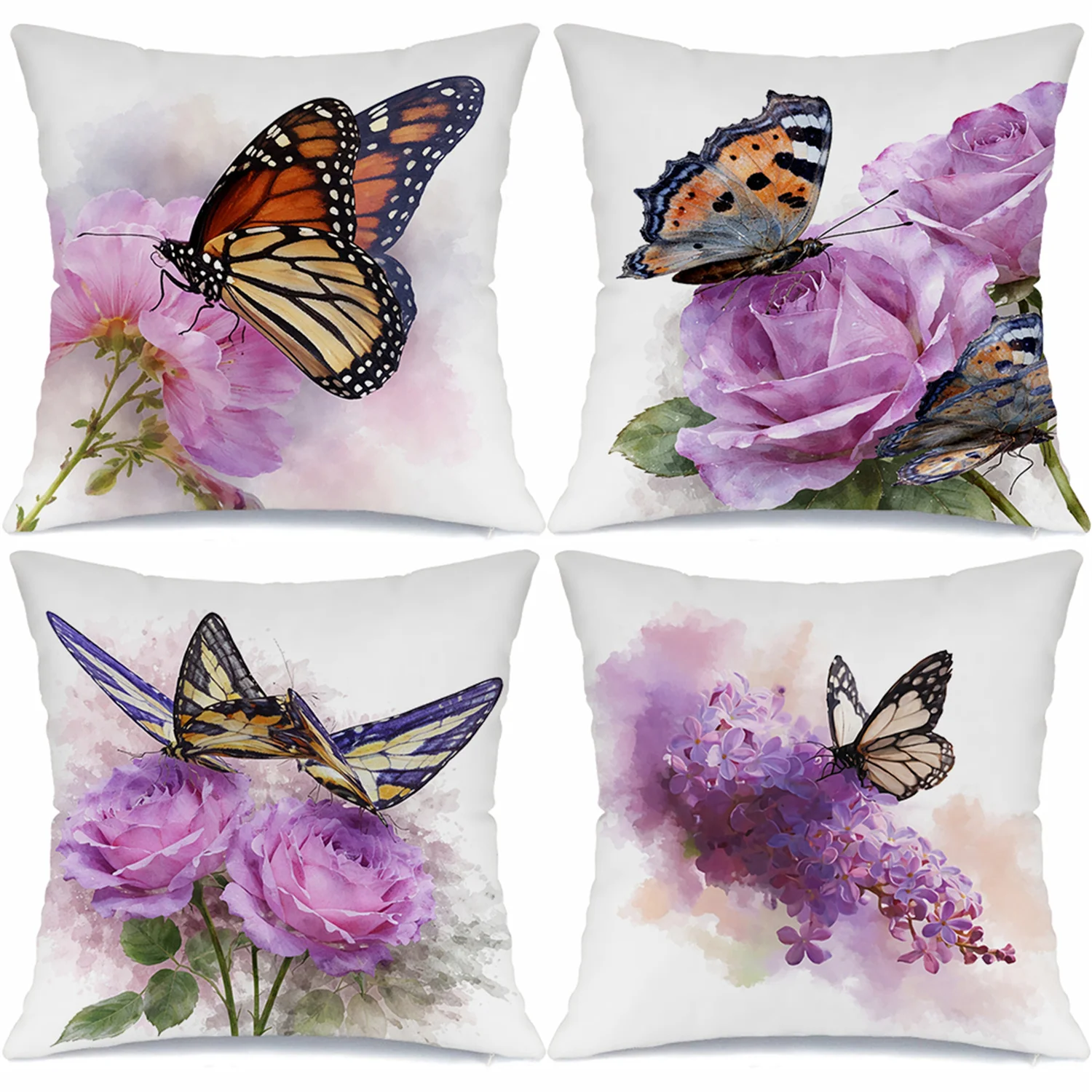 Federe per Cuscini con Farfalle Romantiche, Decorazioni Floreali in Viola e Lilla, Copricuscini Decorativi per Camera da Letto