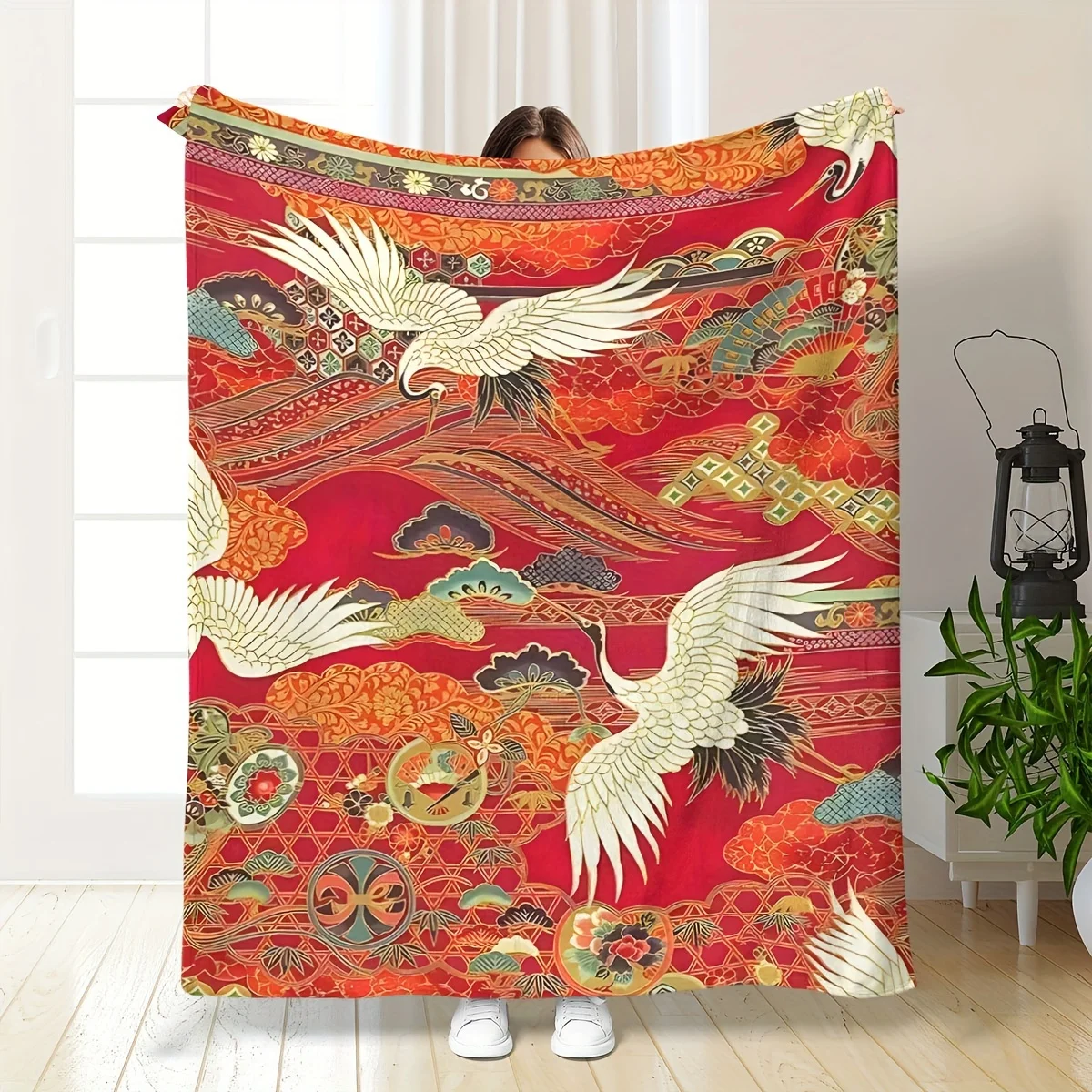Coperta tradizionale con gru e flanella floreale - Lavabile antiallergenico | Rosso/Arancio/Verde/Marrone | Casa/Ufficio/Viaggi per tutte le stagioni