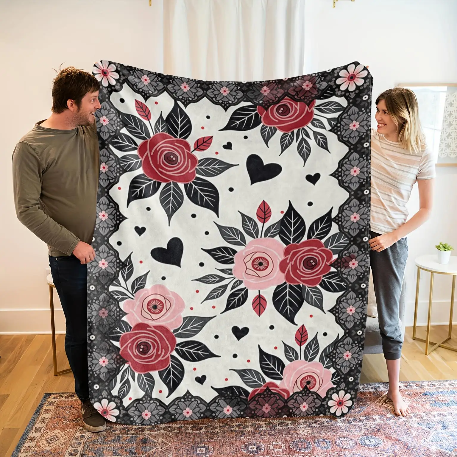 Coperta in pile con motivo romantico a forma di rosa e cuore, design floreale, morbido e accogliente, per la casa, per soggiorno o camera da letto