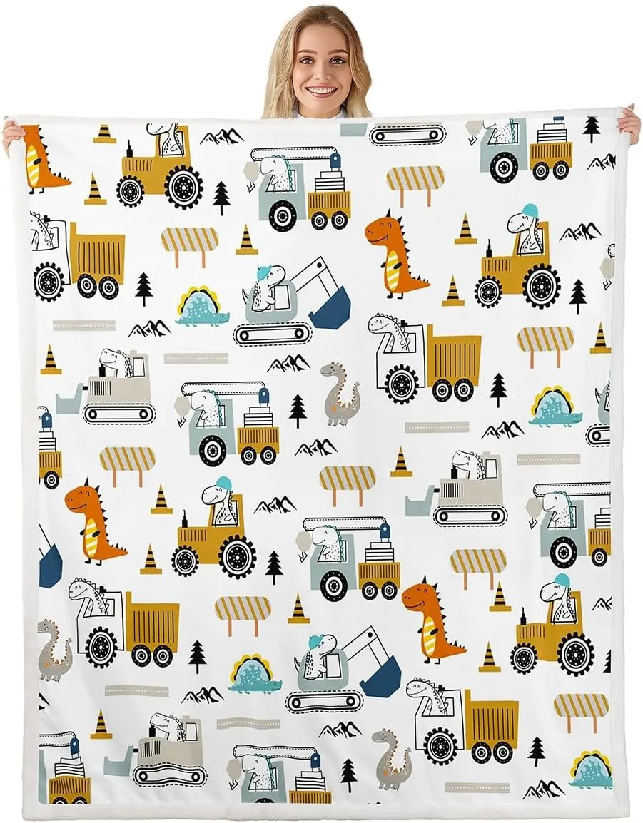 Coperta Sherpa da costruzione Queen Equipment Trucks Coperta in pile per bambini Ragazzi Ragazze Decor Dinosauro Peluche Stampa digitale 3D Giallo