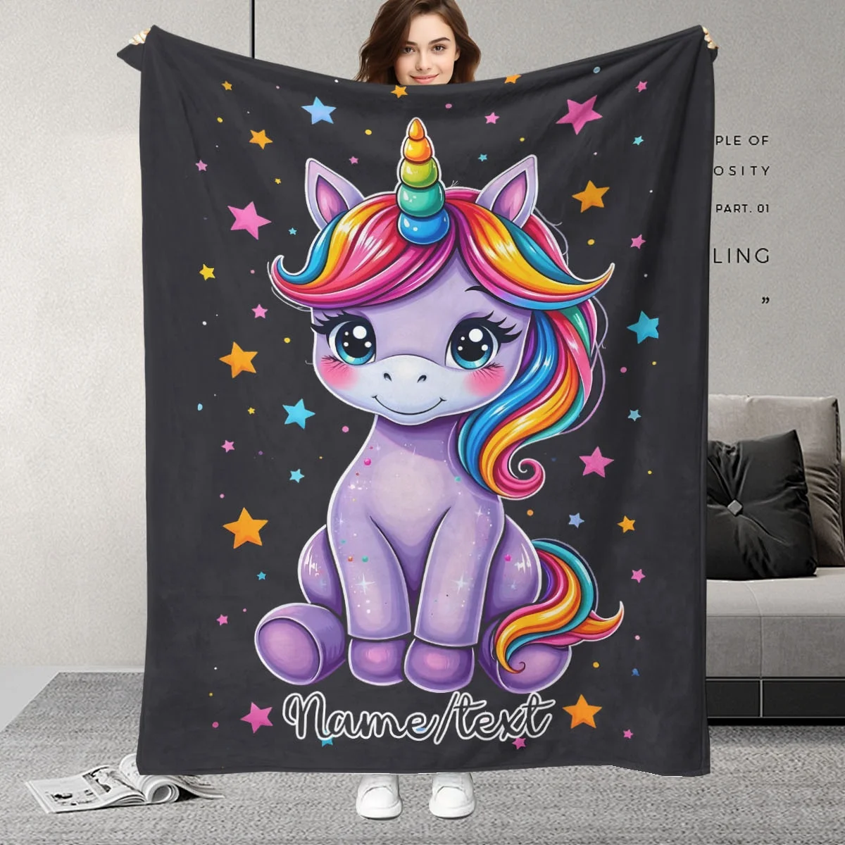 Coperta con motivo unicorno con nome personalizzato, immagine artistica fantasy in corno arcobaleno, regalo perfetto per compleanni e Natale