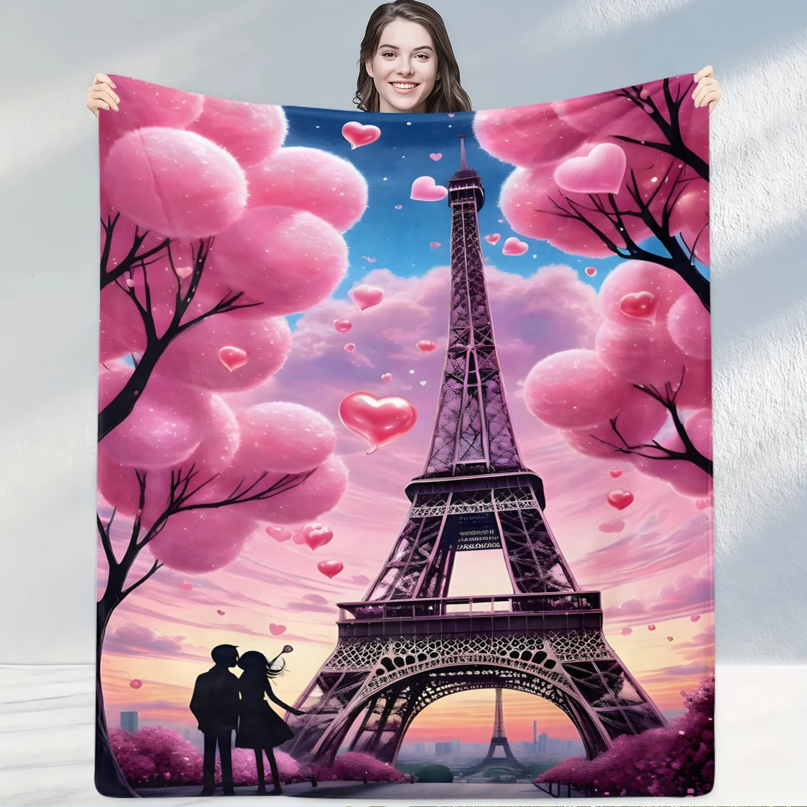 Coperta e coperta Torre Eiffel con ciliegio rosa e cuore: stile dolce romantico, ideale per camere da letto e soggiorni, per l'arredamento a tema amore