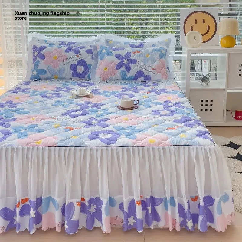 Nuovo Set Tre Pezzi 2023 per Letto Singolo: Copriletto in Cotone Floccato con Stampa e Bordo in Pizzo, Tessili per la Casa