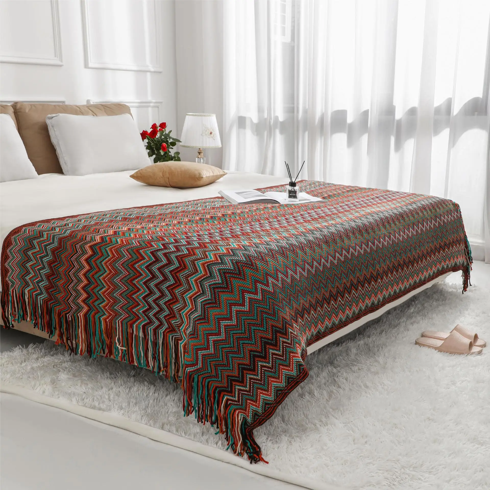 Coperta in maglia stile Ins per letto, copridivano, per agriturismi, hotel, pensioni, plaid decorativo, motivo a griglia in stile giapponese, ricamato