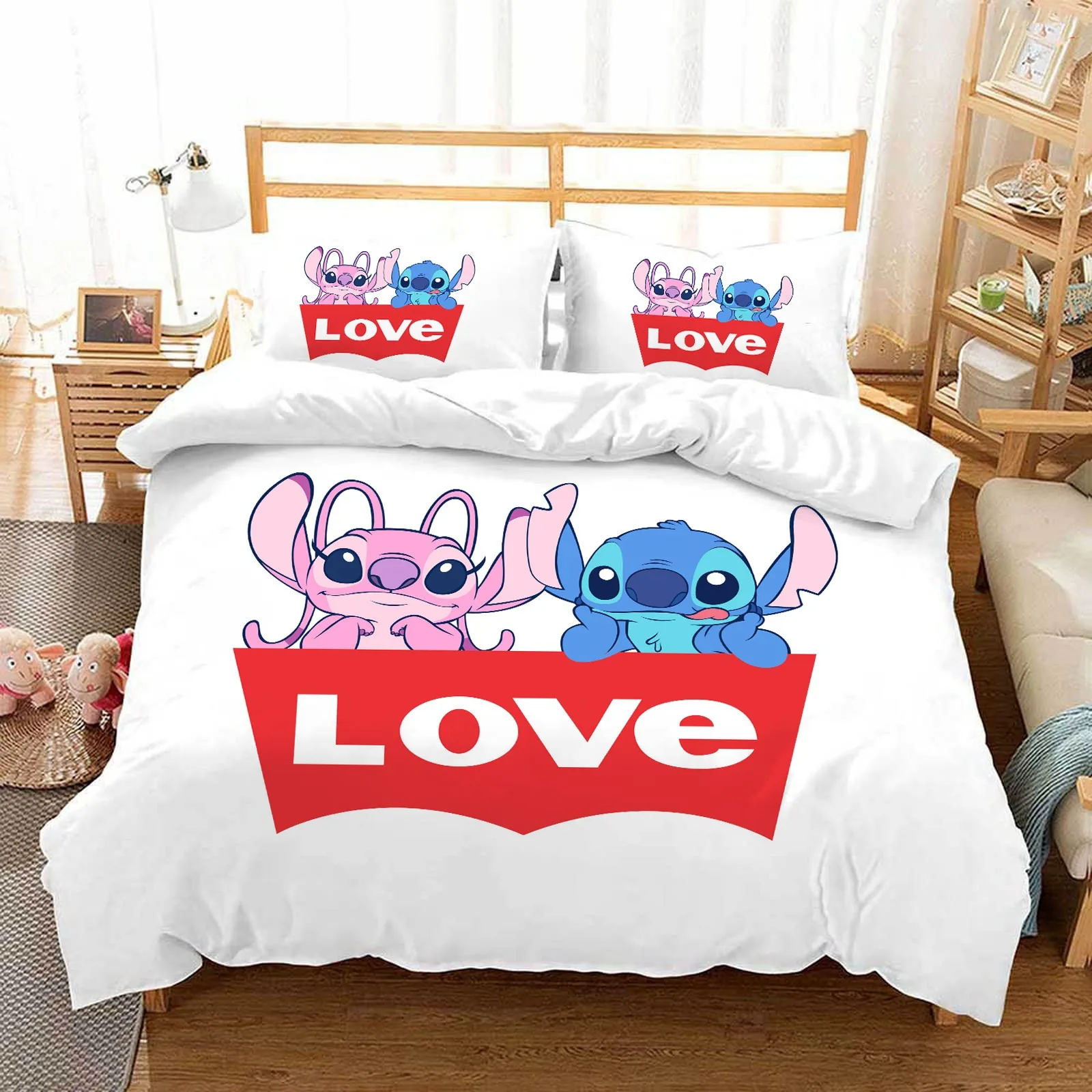 Set di Biancheria da Letto Stitch & Angel Love, Moderno Set Stampato Stitch 2/3 Pezzi Queen Size Copripiumino
