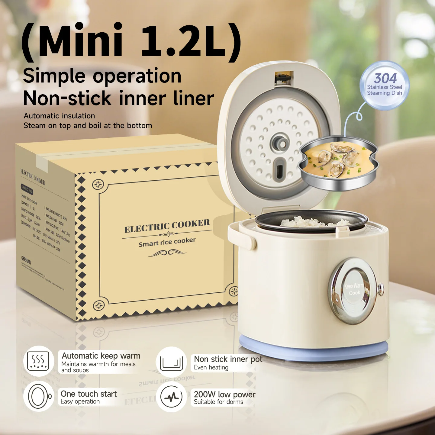 Fornello di riso elettrico 1.2L Mini fornello di riso Fornello di riso compatto Pentola per alimenti per bambini Funzione automatica per mantenere caldo Pentola interna antiaderente
