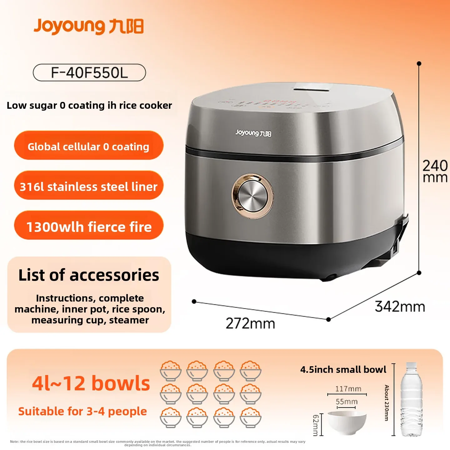 Joyoung 40F550L Cuociriso IH da 4L 1300W a Basso Contenuto di Zuccheri, Rivestimento a Nido d'Ape Senza Coating, Fodera 316L, Certificato 5A, 220V