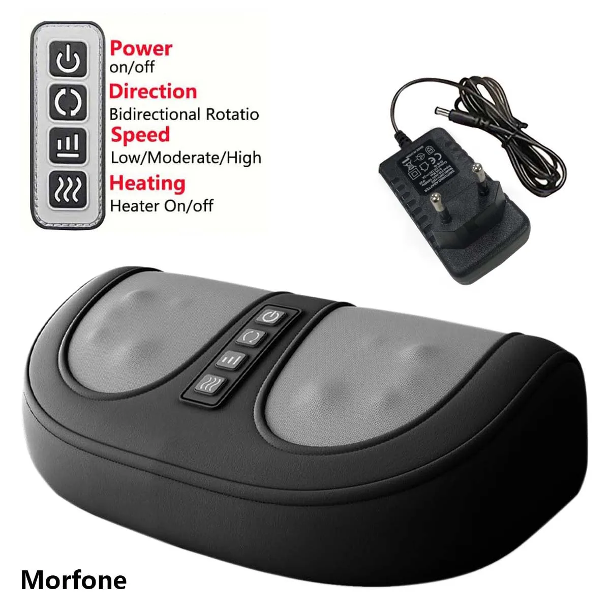 Un massaggiatore plantare nero con massaggio a rullo bidirezionale per le suole dei piedi. Incluso è un alimentatore per