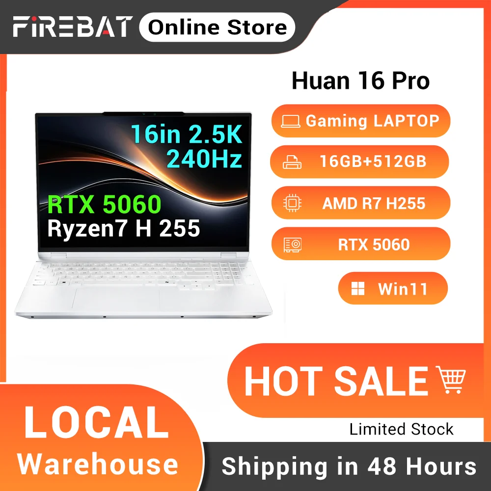 FIREBAT Huan 16 Pro Laptop da Gaming 16 Pollici, AMD Ryzen 7 H255, RTX 5060, DDR5 16GB RAM, M.2 512GB SSD, WiFi6, BT5.3, Schermo 16 Pollici 2.5K 240Hz