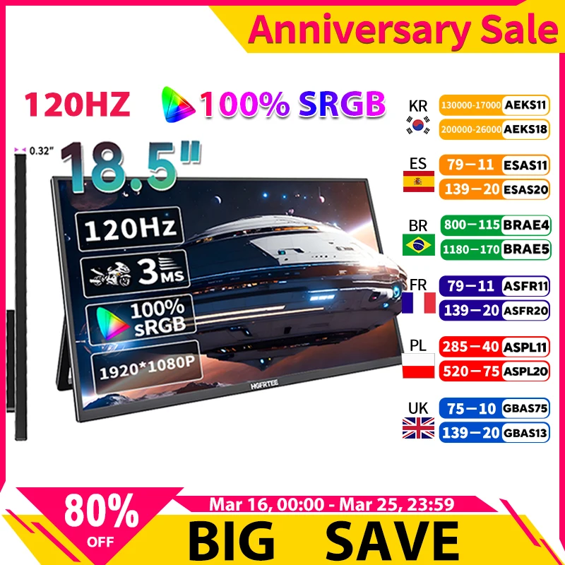 HGFRTEE Monitor portatile Display da gioco per computer da 18,5 pollici 100Hz 100% sRGB FHD 1080P Schermo per laptop Regalo di festa PC PS4/PS5