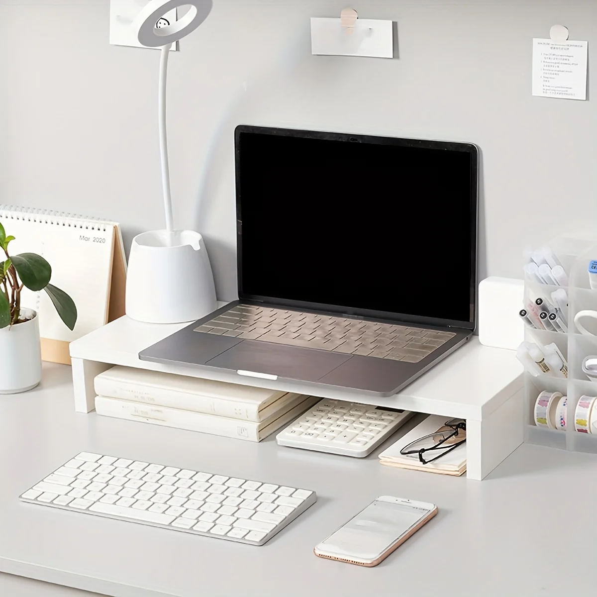 Supporto per Monitor Minimalista in MDF Bianco, Ripiano Portaoggetti da Scrivania per Computer, Forniture per Ufficio