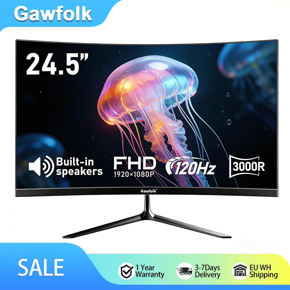 Monitor Curvo Gawfolk 24,5 Pollici con Altoparlanti Integrati, Senza Cornice, 120Hz, Full HD 1080P, Compatibile con Montaggio a Parete