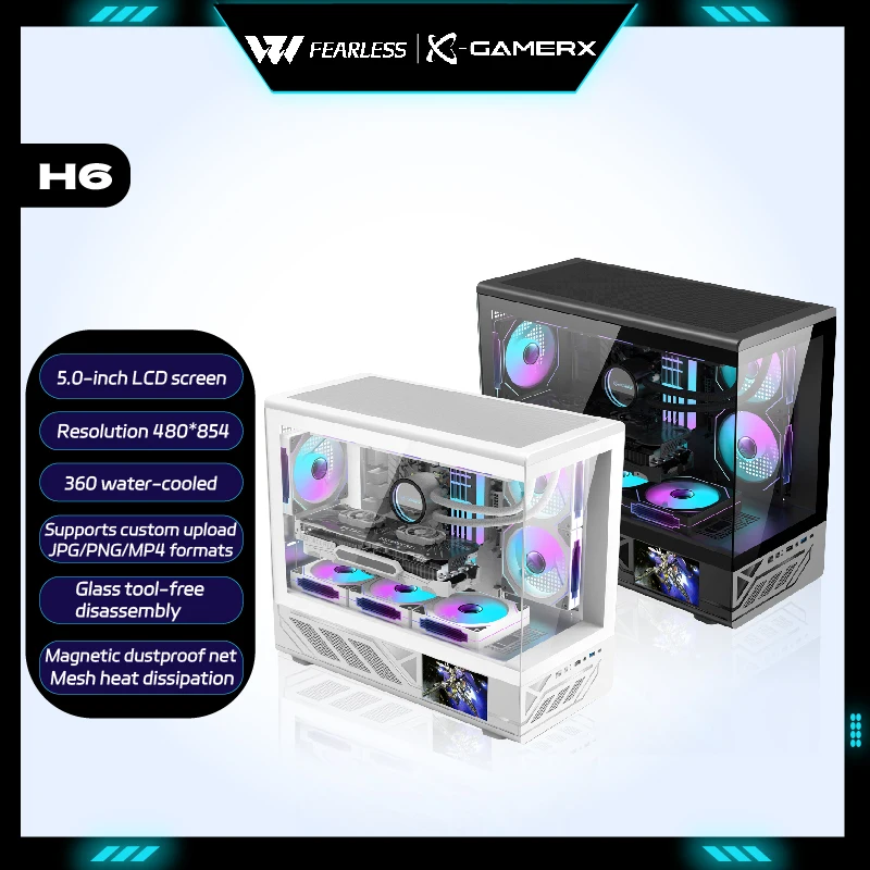 X-GAMERX H6 ESports Custodia da gioco per PC stanza vista mare MATX ITX 360 dispositivo di raffreddamento dell'acqua Tipo-c custodia per computer da gioco Schermo LCD da 5,0 pollici