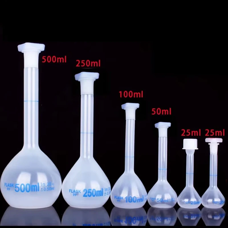 Pallone volumetrico con tappo Pallone dosatore a collo lungo Bottiglia di plastica graduata per forniture di laboratorio di prova 25/50/100/250/500/1000ml
