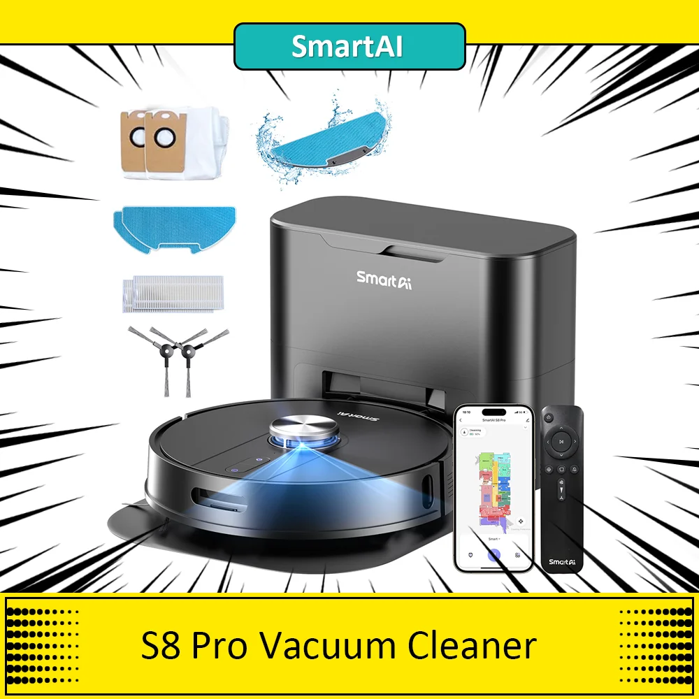 SmartAI S8 Pro Robot aspirapolvere con stazione Base, potenza di aspirazione 5000Pa, serbatoio dell'acqua da 380ml, pattumiera da 3 litri, stoccaggio della polvere da 45 + giorni