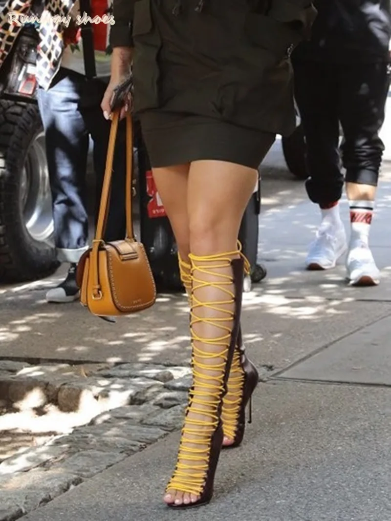 Sandali da donna di lusso con tacco a spillo, sexy, con cinturini incrociati e design a bocca di pesce, sopra il ginocchio, per danza jazz, con blocchi di colore