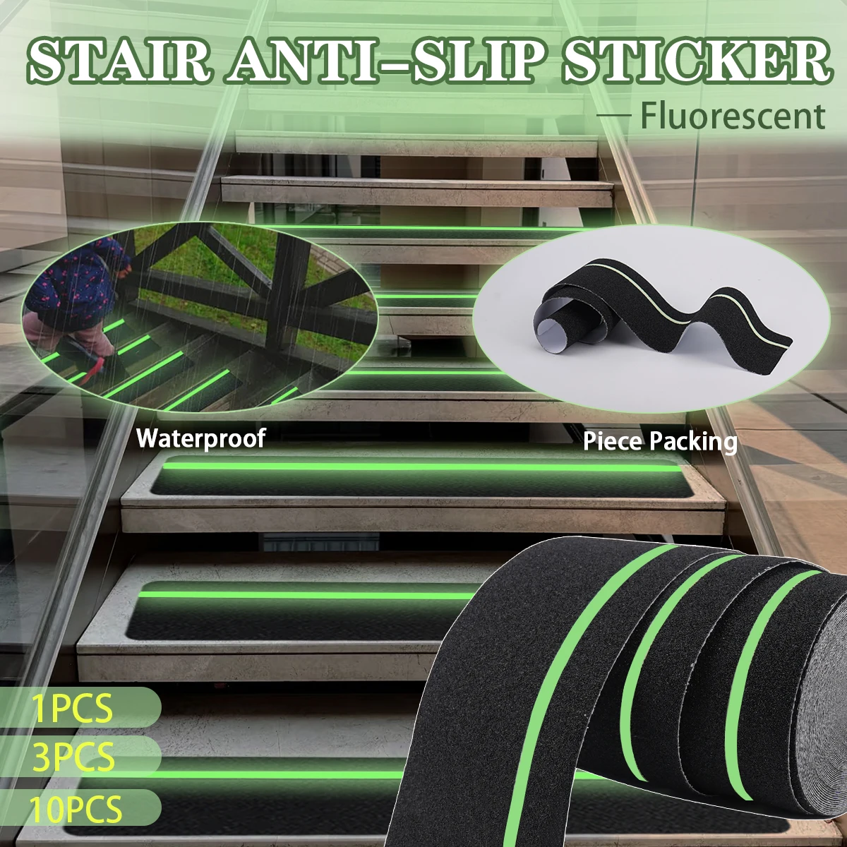 1/3/10 Pezzi Nastro Antiscivolo Luminoso al Buio Verde Nero Adesivo Riflettente di Avvertimento Cinghia di Sicurezza Antiscivolo per Scale, Pavimenti e Rampe