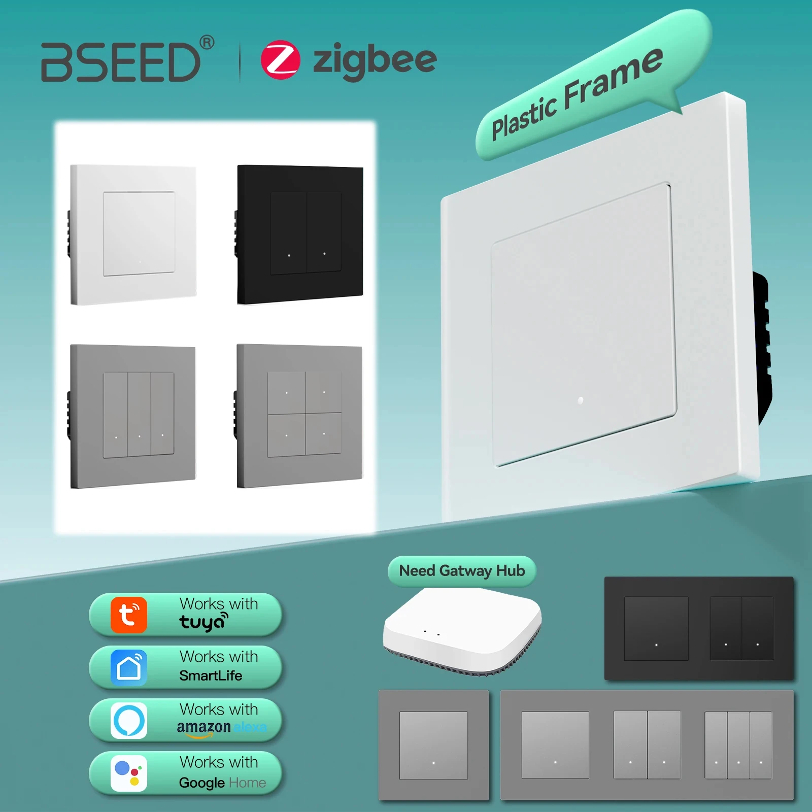 BSEED Zigbee Interruttori a Clic 1/2/3/4Gang Interruttori della Luce Intelligenti da Parete Retroilluminazione Gialla Telaio in Plastica Tuya APP Interruttore per scale Serie E