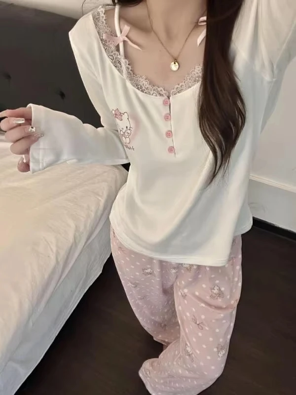 Set pigiama grigio Hello Kitty da donna, pigiama a maniche lunghe, morbido e confortevole, con stampa e finiture in pizzo, abbigliamento da notte in due pezzi, Kawaii