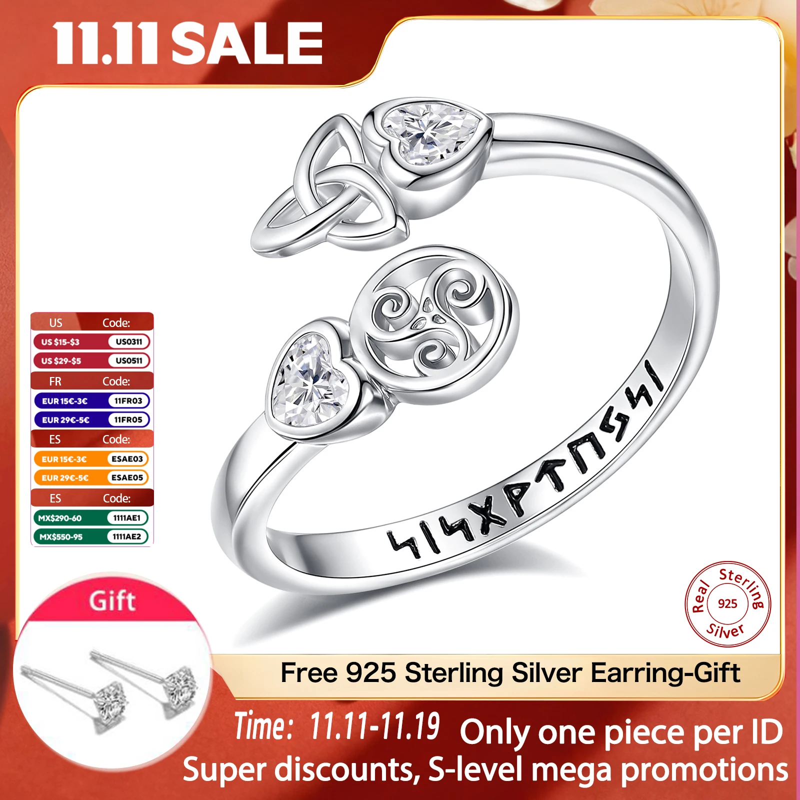 Eudora 925 Sterling Silver Nodo celtico Triskelion Anello regolabile Rune vichinghe Anello aperto Wicca Gioielli pagani Regalo per le donne Uomini