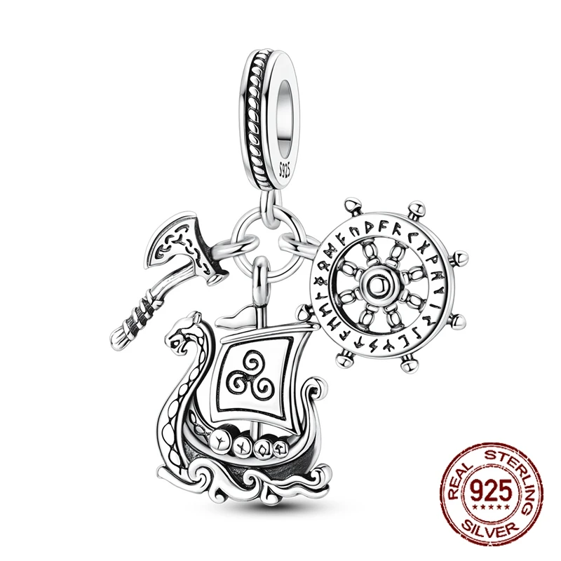 925 Sterling Silver Vichingo Nave Longship Battaglia Ascia Timone Ciondolo Fascino Misura Braccialetti con ciondoli originali Donne Gioielli fai da te Regalo