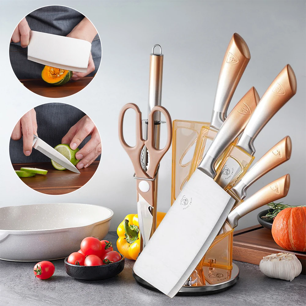 8 pezzi coltelli da cucina-set coltello da chef in acciaio inossidabile di lusso mannaia coltello da pane per sbucciare filetto di pesce carne set manico sfumato oro