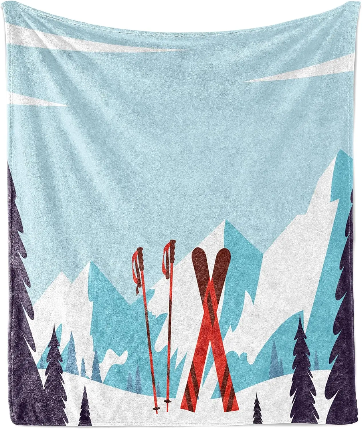 Coperta da sci, bastoncini da sci immersi nella neve su una montatura montuosa nevosa, divano morbido con accento in pile di flanella