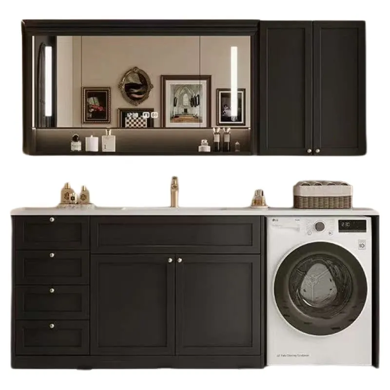 Mobile da bagno antico francese in rovere, mobile per lavatrice, lavabo in ceramica integrato senza giunture con piano in lastra di roccia.