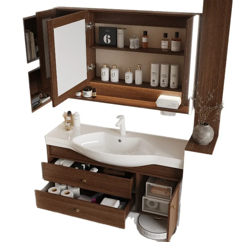 Nuova combinazione in ceramica con lastra di roccia, lavabo integrato, mobile da bagno medio antico, vernice per bagno, lavaggio in rovere